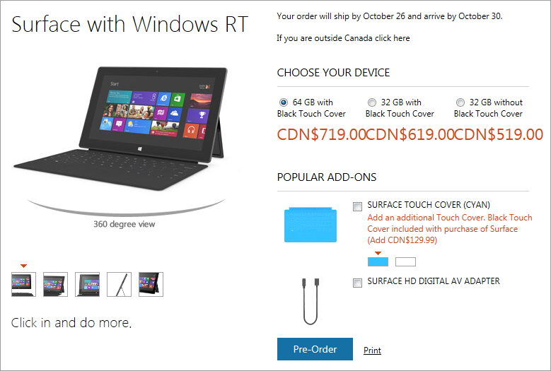 It looks like your order will ship by October 26 and arrive by October 30. If you want to try to get it sooner, then try visiting a Microsoft "Popup Holiday” Store. I know I will to checkout the device first hand and probably buy one.