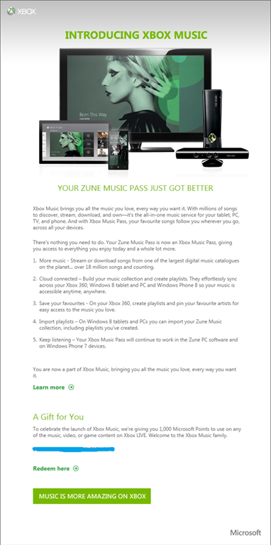 If your currently subscribe to the Zune Music Pass, this has now changed to Xbox Music. As depicted below, you should have got an email from Xbox with a gift of 1000 Microsoft Points to use on any of the music, video or game content on Xbox Live.