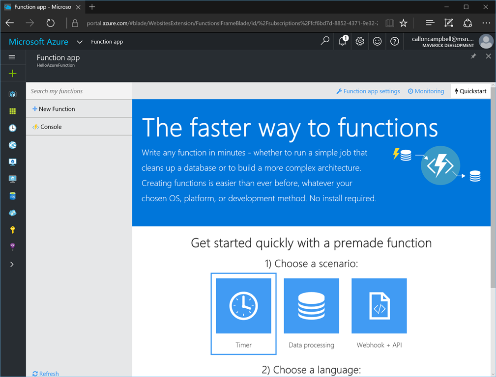 You can quickly get started with creating an Azure Function by going to the Azure Functions Get Started Portal. After logging in you will be taken to the Azure Functions getting started portal as shown below.