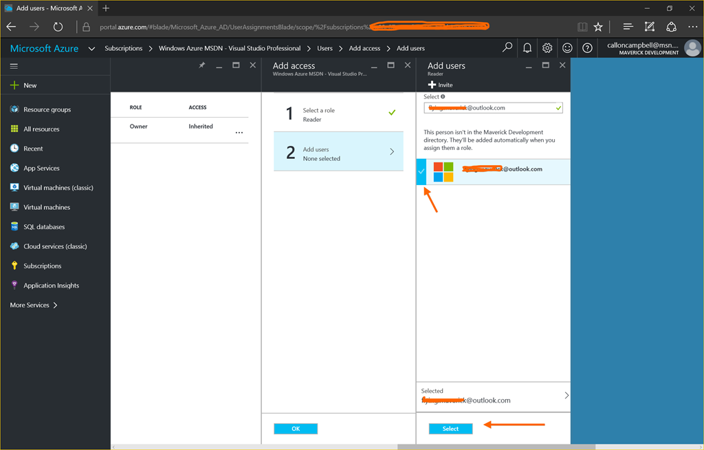 After selecting the role for the user, click Select. Now you will need to invite a user. Type in the email address for their Microsoft Account. The user will then show up below. Make sure their email is selected with a checkmark. Then click on the Select button.