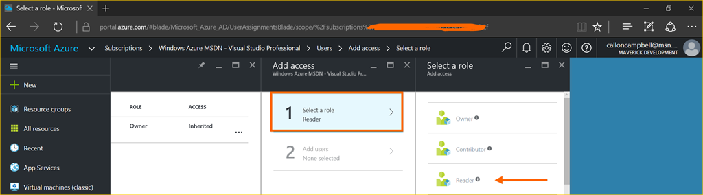 The add new user blade will now open up. First thing that is required is to select a role for this user. There are numerous roles available. In this case I just want this user to have the Reader role, which allows them to view data only: