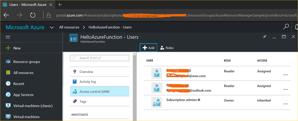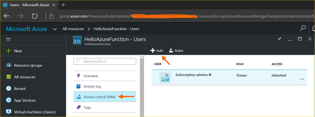 Once you’ve added the user you can now navigate to a specific Azure Resource and assign the user. Let’s do this now with an Azure Function I have.