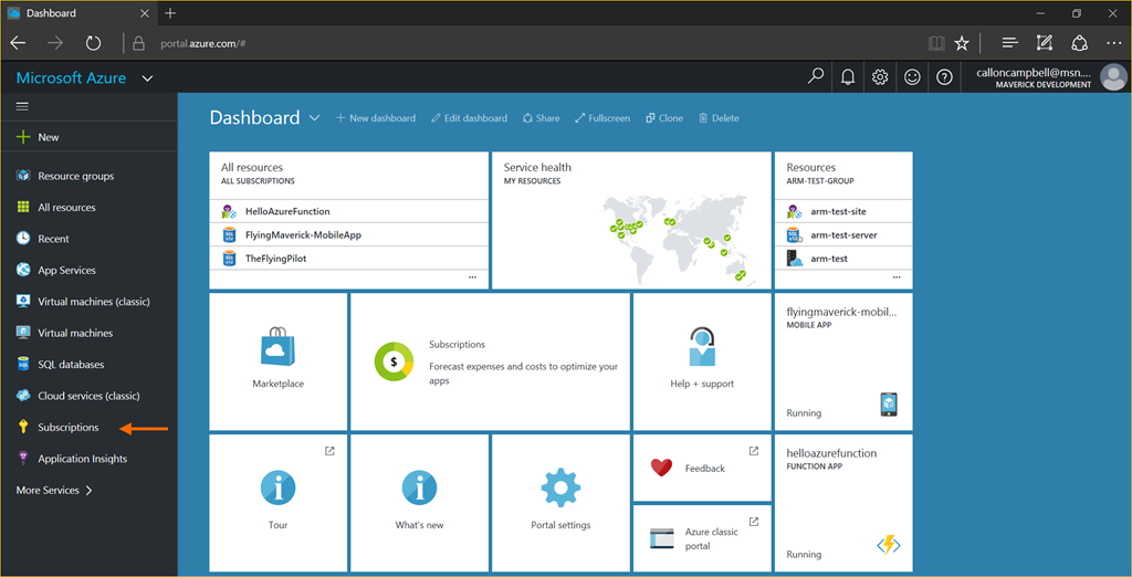 After logging in to your Azure portal, click on the Subscriptions navigation link on the left pane.