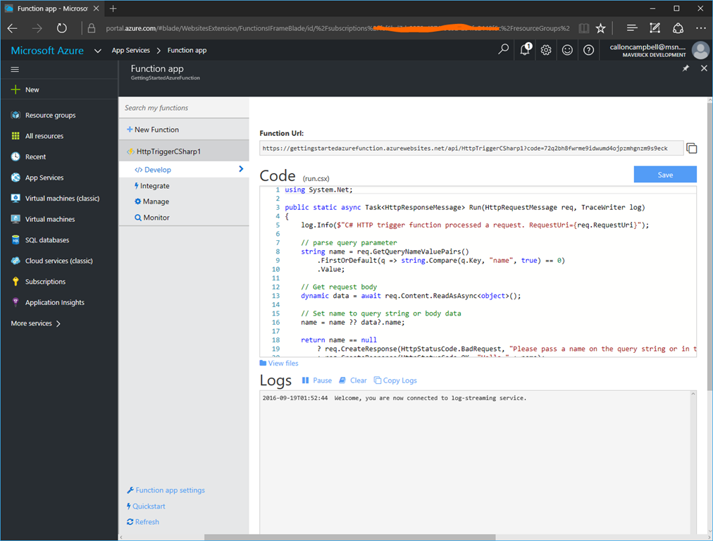 In a future post I will walk through integrating an Azure function with another Azure resource.