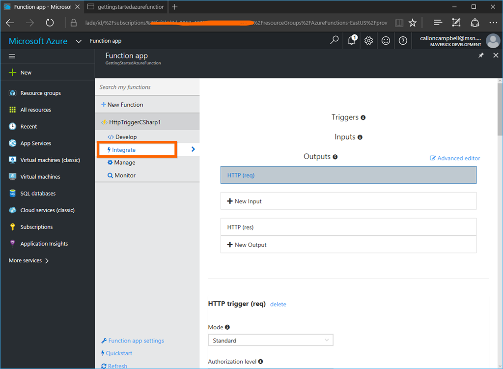 Now that you have your Azure Function you will most likely want to integrate it into other Azure resources or other apps. If you click on the Integrate tab of the function, you can quickly define an integration (triggers, inputs and outputs) and there is also an advanced editor available if needed.