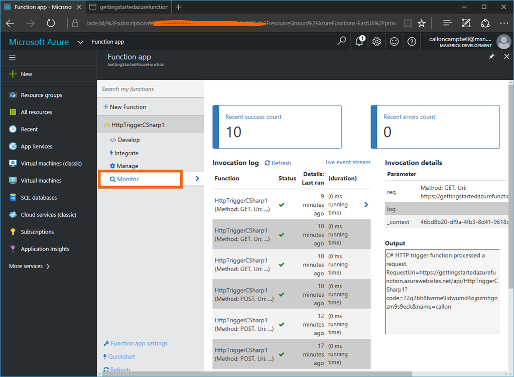 Now that your function is up and running you can easily monitor it by going to the Monitor tab of your function. From here you can see recent success and error counts and inspect the function requests.