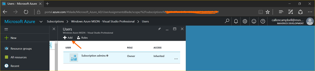 You will then see a blade open up to the right for the selected subscription. In your subscription blade will be an icon for users (top right corner of the Essentials pane). Click this button to manage users for this subscription.