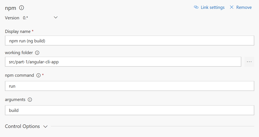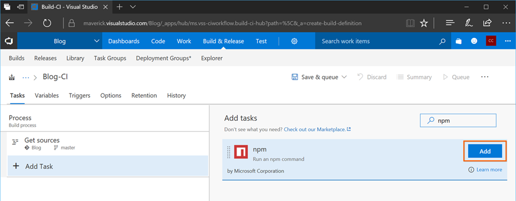 I then configured the Get sources task to point to our GitHub repository and then I added in the last two steps for generating a NuGet package and to copy the generated NuGet package to an Azure Storage account: