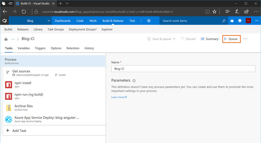 To get started I headed over to my Visual Studio Team Services account I had setup with my MSDN subscription and I then created a new project to contain my builds. I then clicked on the Build & Release tab and then clicked on the New button to create a new build definition: