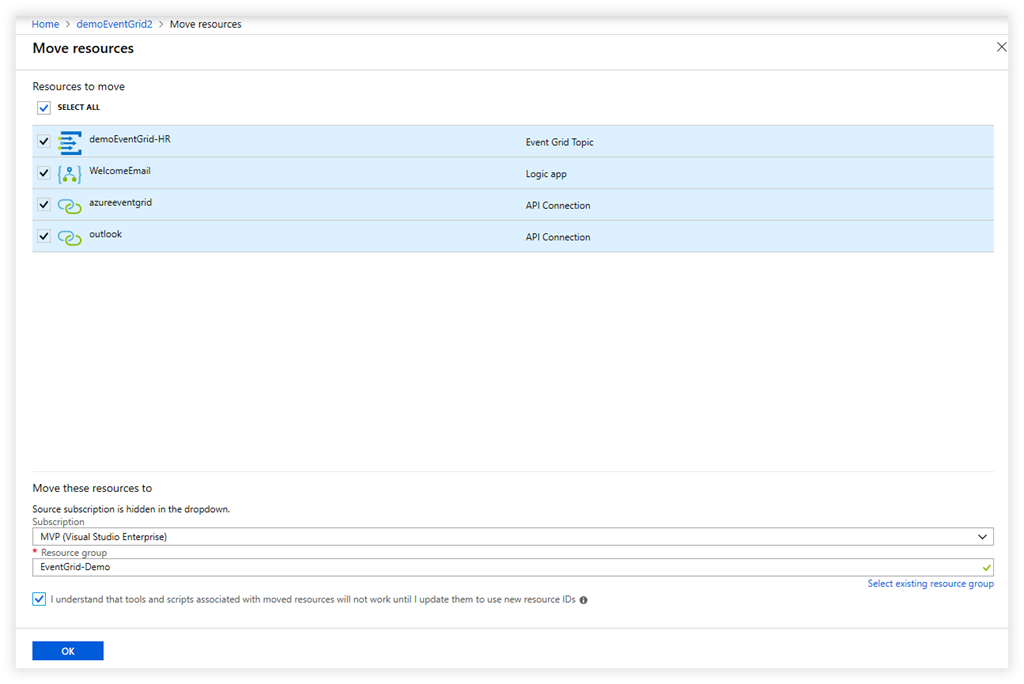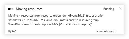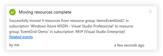 Step 4 – Now click on the OK button to start the process. The job will then be validated and then you will see a notification of the movement in progress, followed by a success or failure notification. In the event of a failure, details will be provided on why the resources could not be moved. Usually after working through these issues you can try again.