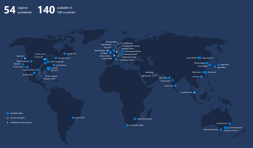Microsoft Azure now has a total of 54 regions worldwide that span 140 countries. That’s more than all other cloud providers combined – offering the scale needed to bring applications closer to your users around the world, preserving data residency, and offering comprehensive compliance and resiliency options.