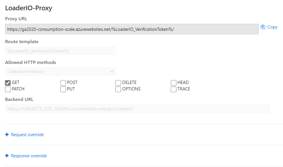 In order to show the cold start and latency issues with the Azure Functions Consumption plan and how the Premium plan avoids this I was using a load testing site called Loader.io. This tool required that the host URL be verified with a special token that had to be returned from the site. In order to map my Azure Function result to the expected URL that loader.io wanted I needed to configure and Azure Function Proxy.