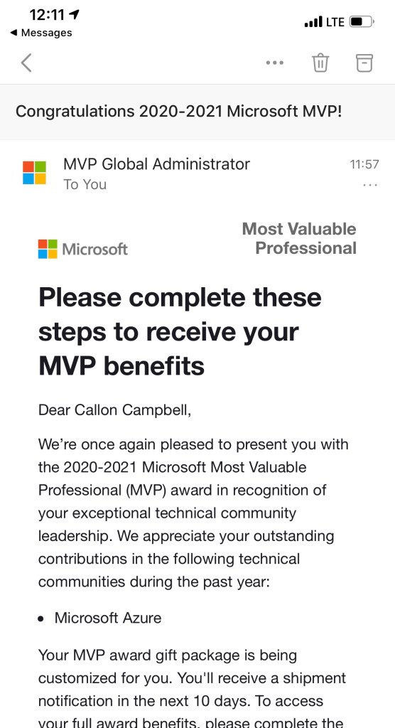 This week I received an exciting email from Microsoft that I was re-awarded for a third year now for the 2020 – 2021 Microsoft Most Valuable (MVP) award in Azure. Receiving the Microsoft MVP award is both a humbling and an exciting experience. It means you’re a member of a select group of experts of just over 2,000 MVPs from around the world, but I like to think of it as doing something I’m passionate about with other like minded individuals, having fun and always having something new to learn and share with the community.