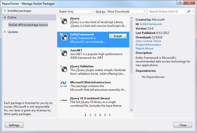 The following illustration shows the Manage NuGet Packages dialog box. You can access this by right clicking on your project in the Solution Explorer and then click on the Manage NuGet Packages… menu item.