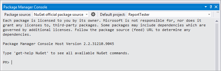 The following illustration shows the Package Manager Console in Visual Studio. This console window lets you run NuGet PowerShell commands.