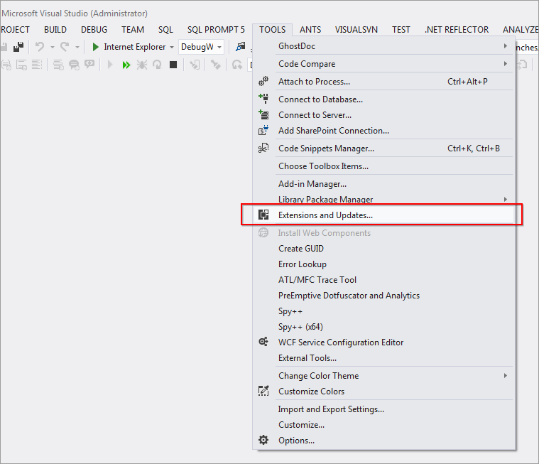 To get started, you will need to download and install NuGet. Launch Visual Studio and then go to the Tools menu, then select the Extensions and Updates… menu item.