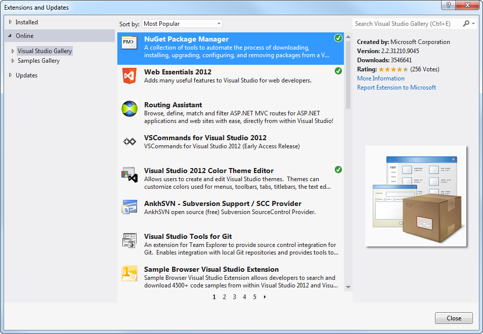 Then in the Online section, search for NuGet Package Manager or usually this is listed as one of the top items in the Visual Studio Gallery section.